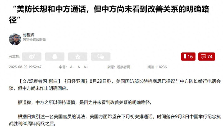 美防长上任大半年了,但一直被中方晾着,如今随着中国三场盛会在即,特朗普访华未能成行,五角大楼开始着急起来了,赫格塞思提议与董军防长通电话,结果中方“已读不回”,然而美方仍旧不死心,想在九三阅兵后中美见一面。